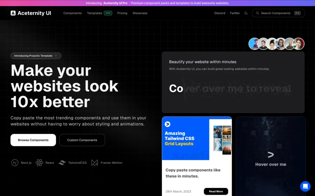 إذا كنت تبحث عن إضافة لمسة من الرسوم المتحركة والإبداع إلى مشروعك، فإن Aceternity هي الحل. مستوحاة من Shadcn، تدمج هذه المكتبة بسلاسة مع Framer Motion لإنشاء مكونات متحركة مذهلة.